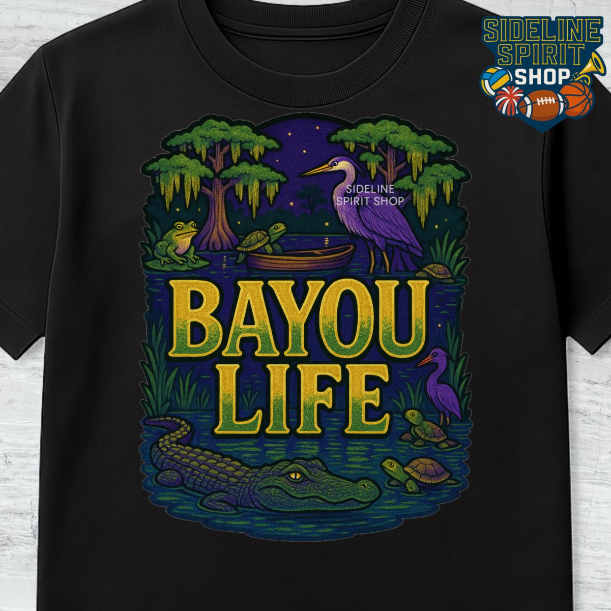 Welcome to Bayou Life—where the nights are calm, the water runs deep, and the wildlife tells the story. This tee features a richly illustrated Louisiana bayou scene with cypress trees, a heron, turtles, frogs, a boat, and an alligator cruising through the swamp. It’s the perfect shirt for anyone who loves the outdoors, southern culture, and that one-of-a-kind bayou energy.