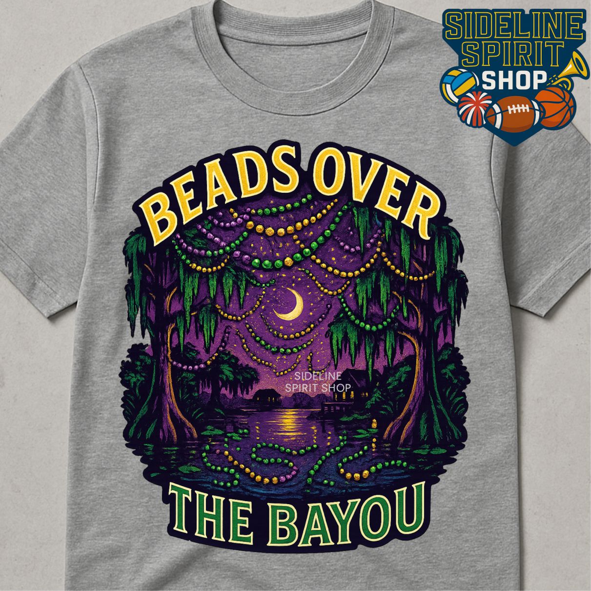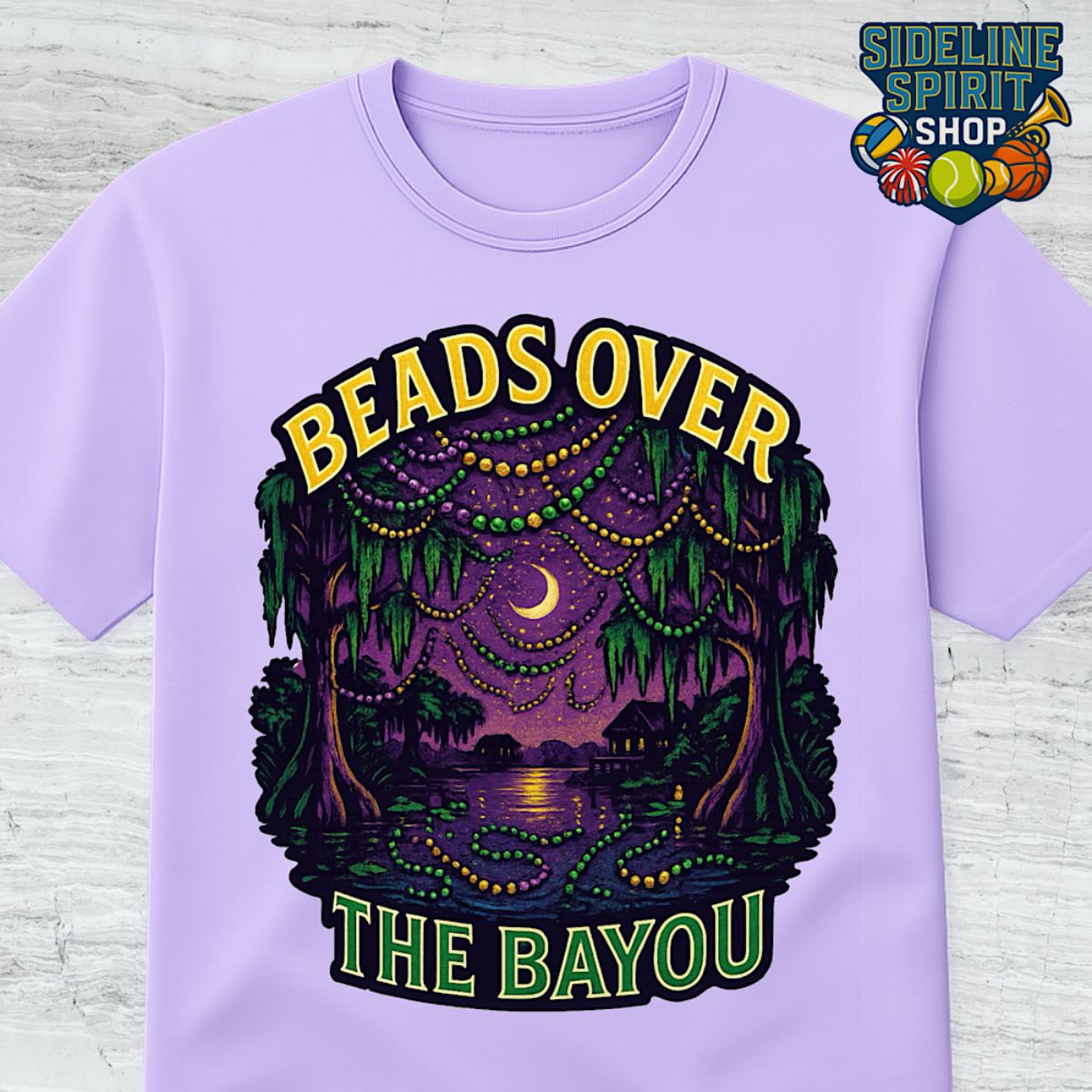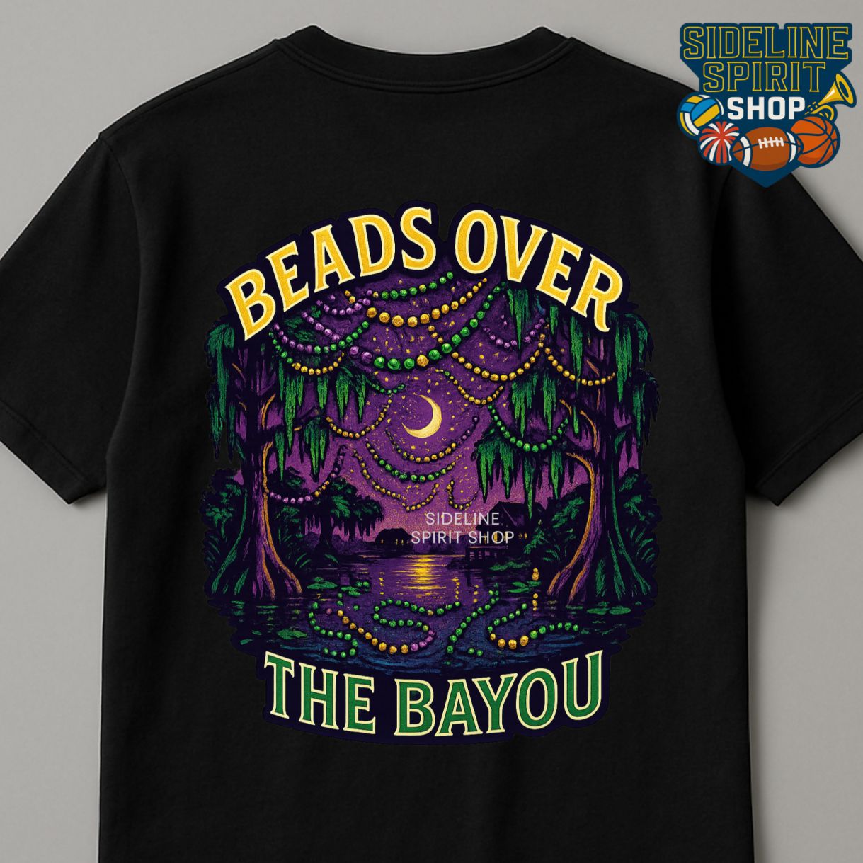 Bring the magic of Louisiana nights to carnival season with the “Beads Over the Bayou” t-shirt. This design blends Mardi Gras tradition with true bayou scenery—moonlit water, mossy cypress trees, and bead strands draped across the swamp like the parade never ends.