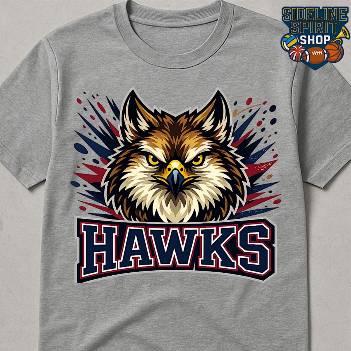 Bring big Hawk pride to game day. This bold Hawks spirit tee features a fierce hawk face with dynamic navy and red splash accents and varsity “HAWKS” lettering—perfect for pep rallies, student section nights, and school events.