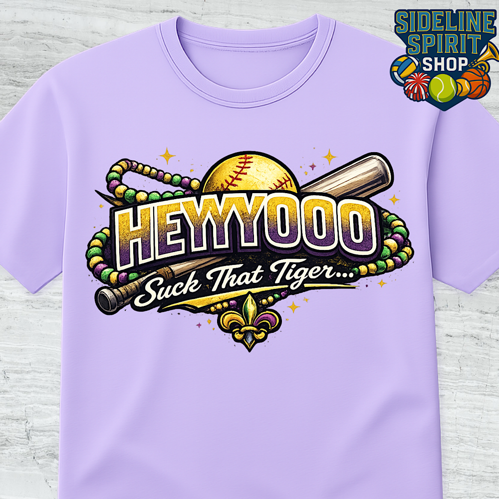 Bring Louisiana spirit to the ballpark! This “HEYYYOOO Suck That Tiger…” tee combines Mardi Gras beads, a fleur-de-lis, and a bat-and-ball look for a bold, high-energy design that’s made for softball/baseball season and rivalry games.