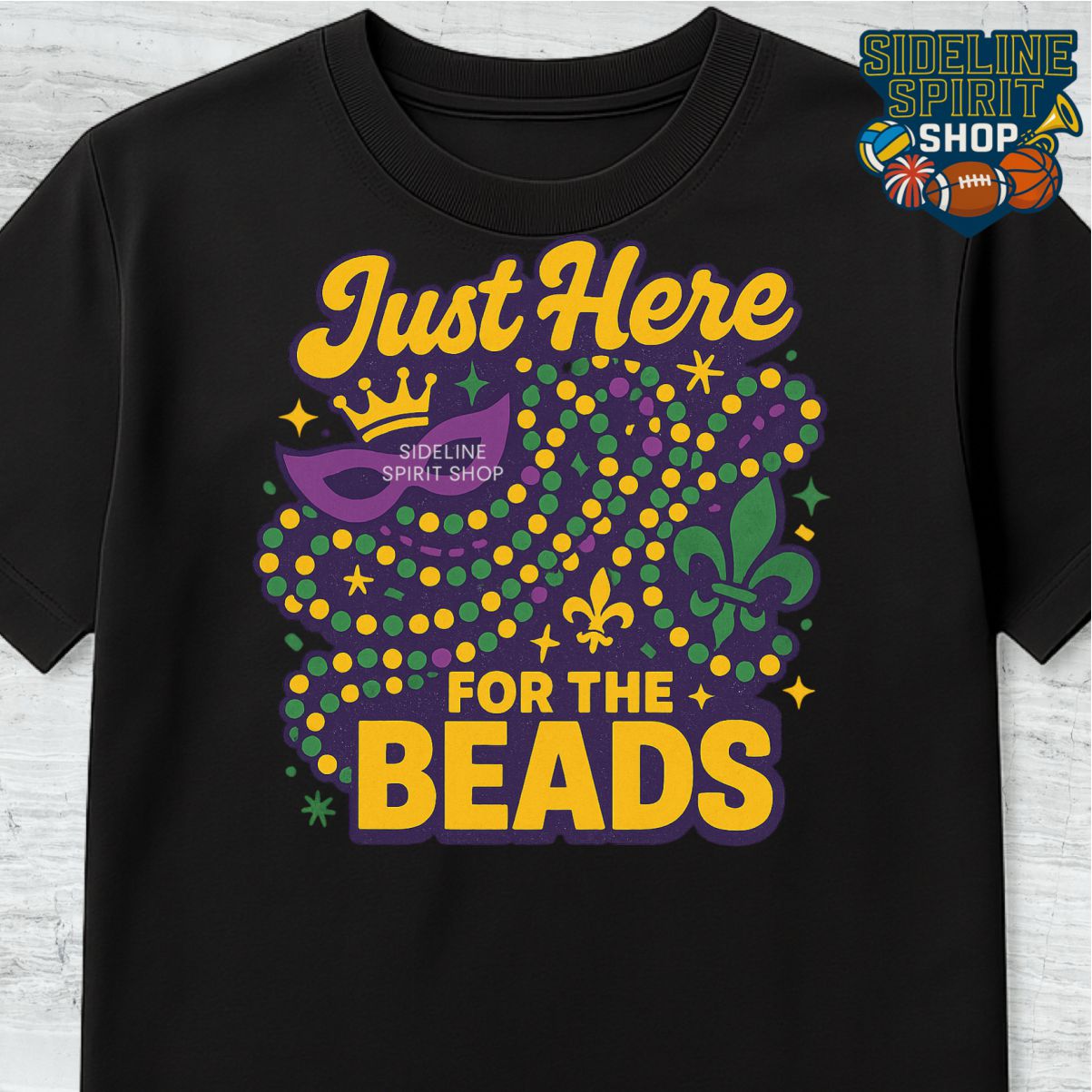Some people come for the music… some come for the food… but you? You’re Just Here for the Beads. This fun Mardi Gras tee brings all the parade-day energy with a bold design featuring colorful bead loops, a festive mask, sparkles, and fleur-de-lis details. It’s the perfect shirt for anyone who loves the throws, the laughs, and the carnival chaos.