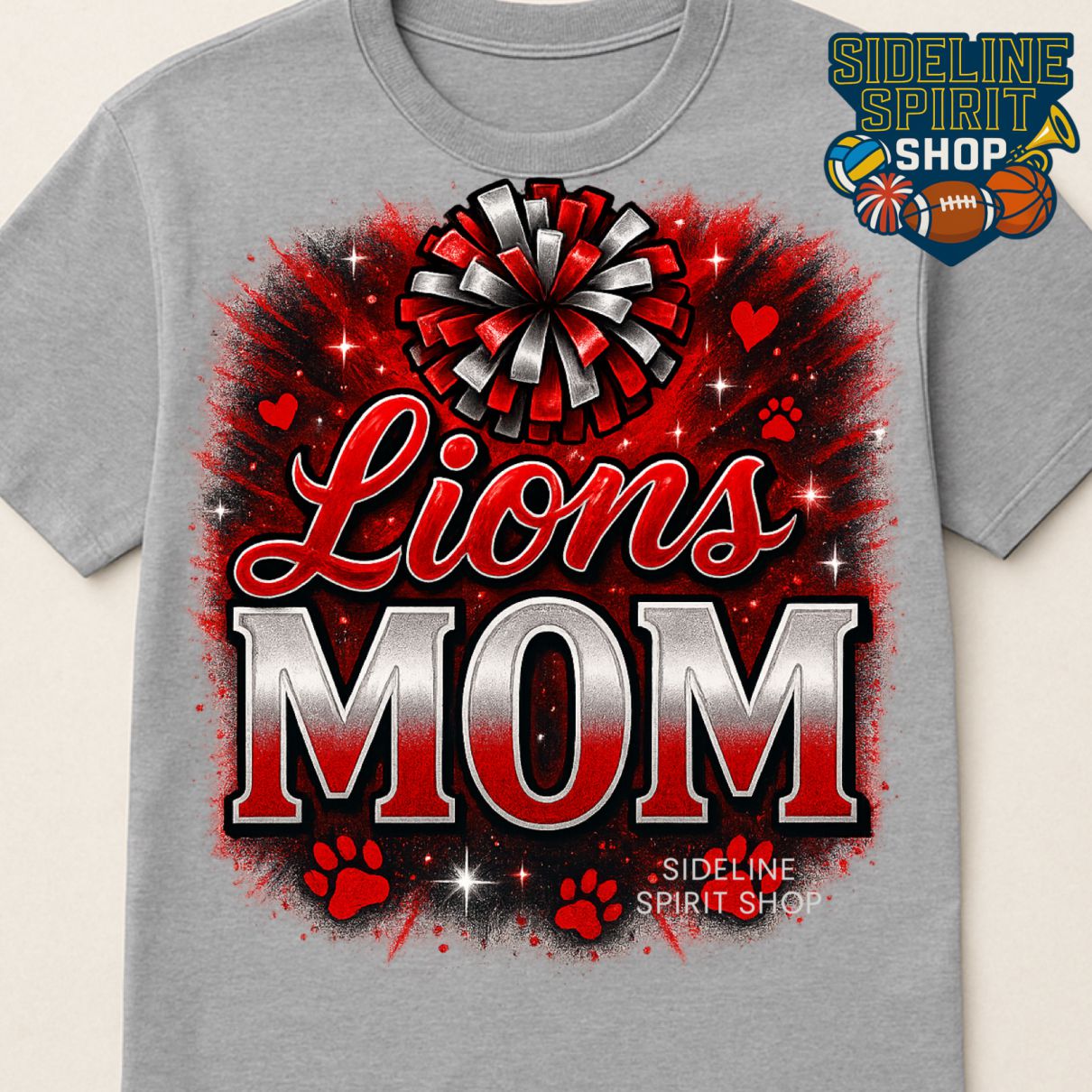 Bring the spirit and show your pride with this Lions Mom cheer t-shirt. Designed with a bold varsity-style “MOM,” a fun pom pom graphic, paw prints, hearts, and sparkling accents, this tee is made for the moms who show up, cheer hard, and rep their Lions everywhere.