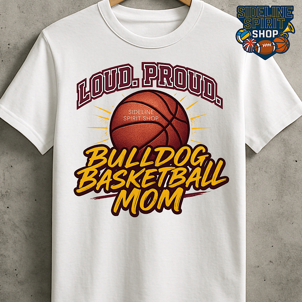 Show up for every tip-off with Bulldog pride. The Loud. Proud. Bulldog Basketball Mom tee is made for the moms who bring the energy from warm-ups to the final buzzer. With a bold basketball centerpiece and strong, eye-catching lettering, this shirt is a go-to for basketball season and looks great in team photos.