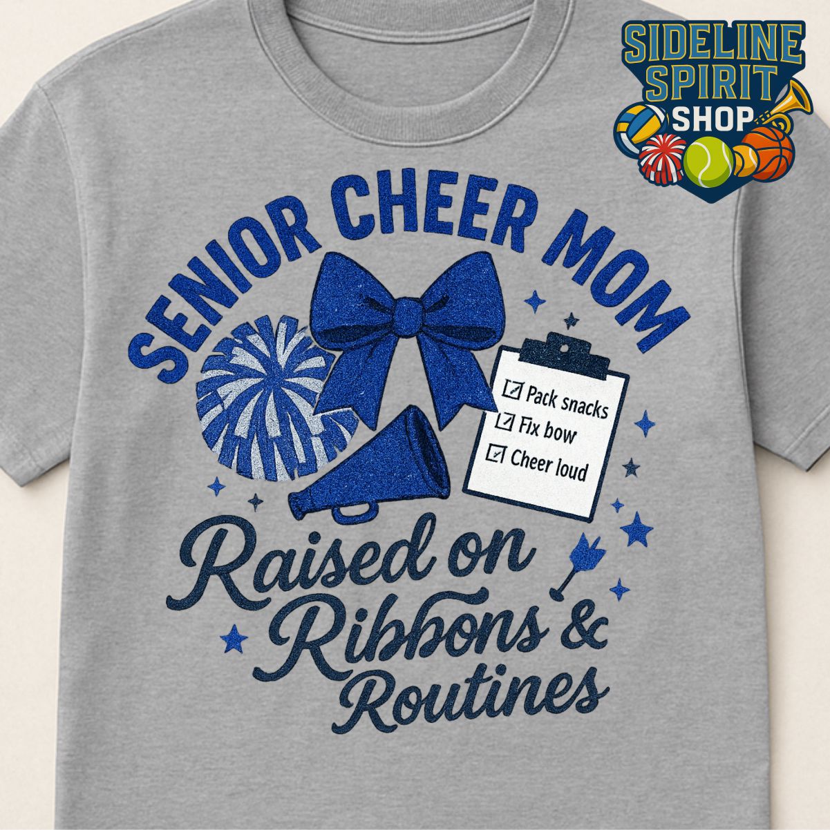 For the proud senior cheer mom who’s been through it all—bows, pep rallies, and competition weekends. This “Senior Cheer Mom – Raised on Ribbons & Routines” tee features a bow, pom, megaphone, and a checklist (Pack snacks, Fix bow, Cheer loud). Perfect for senior season, games, and cheer events.