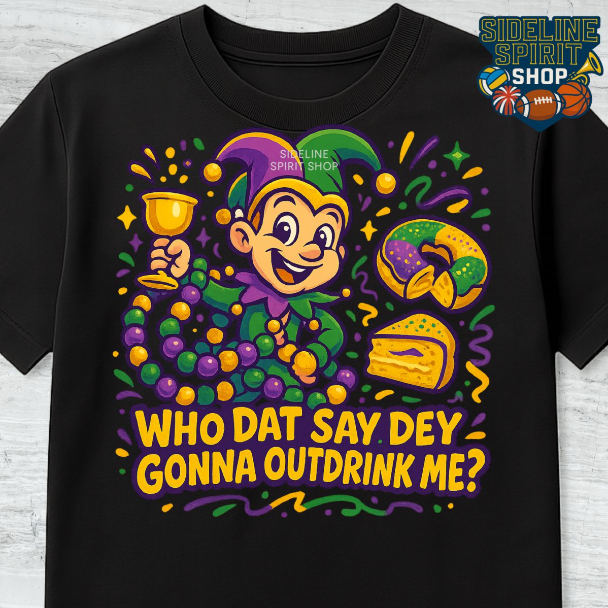 If you’re the life of the parade route, this one’s for you. The “Who Dat Say Dey Gonna Outdrink Me?” Mardi Gras t-shirt brings bold Louisiana humor with a festive jester, beads, a raised drink, and classic Mardi Gras treats like king cake. It’s loud, funny, and guaranteed to get laughs from your whole crew.